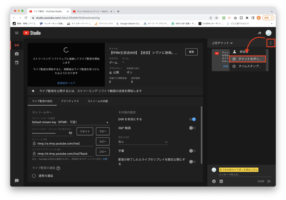 『Youtube Studioライブ配信管理画面』のコメント欄(右側)にある『三点』→『チャットをポップアップ』の順にクリック。