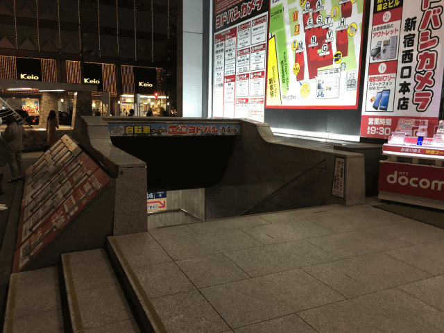 JR新宿駅西口改札からなら、階段を上り下りせずに、受付場所である『携帯スマートフォン館地下2階 自転車コーナー』にたどり着けます。