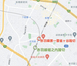 北池袋駅から北側(板橋方面)に行ったところに、線路が二股に別れている2つの踏切があります。